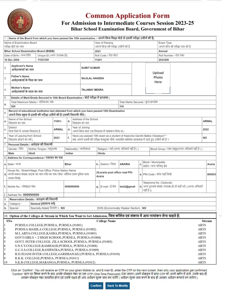 - Step 6 – After entering all the information, click on the “Submit” button. This will display a preview of your filled Common Application Form. Review all the details carefully, and if everything is correct, click on the “Confirm” button. Once you confirm, you will be redirected to the confirmation page linked to your mobile number.