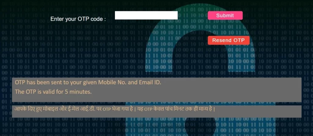 - Step 7 – You will receive an OTP (One Time Password) on your registered mobile number. Enter the OTP and then click on the “Submit” button.