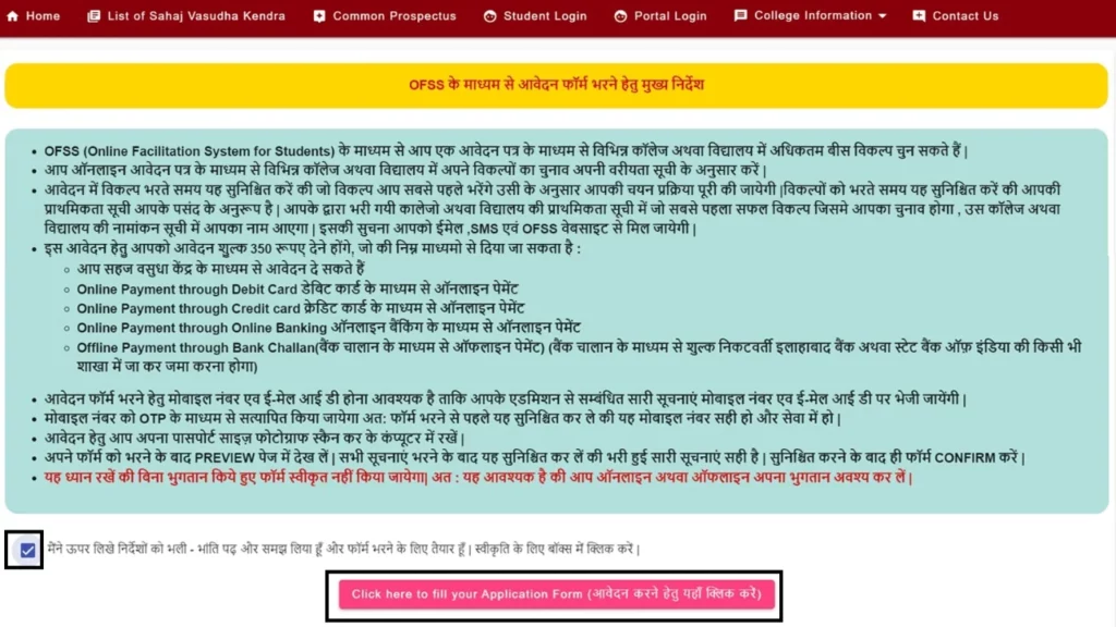 - Step 2 – Tick the checkbox to agree to the terms and conditions, then click on the “Click here to fill your Application Form” button to proceed.